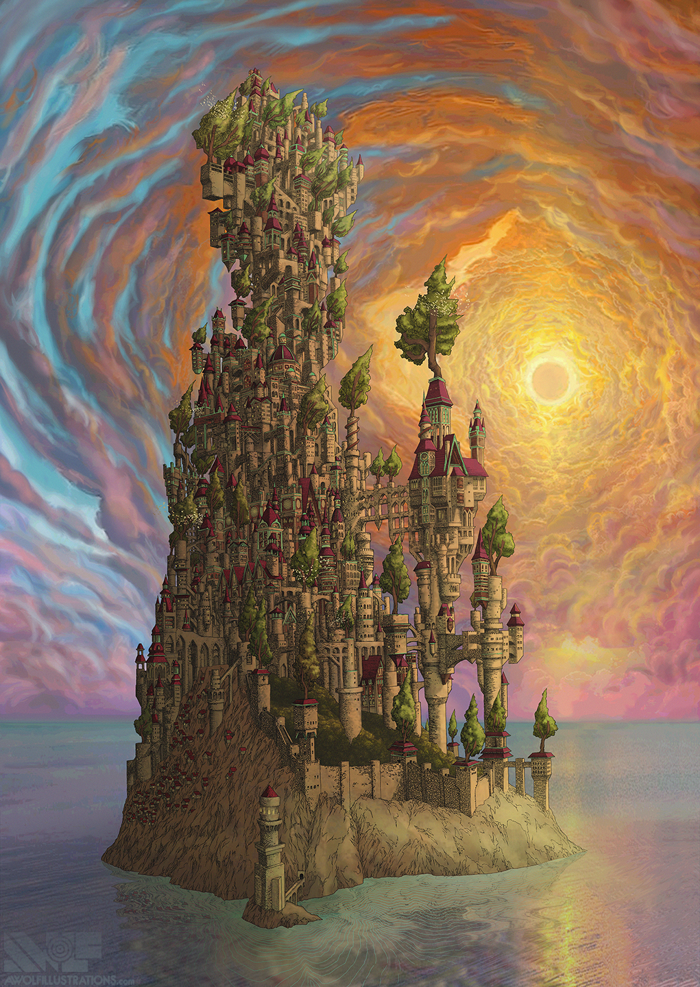 I recoloured this image specifically for this puzzle project, knowing that the original coloured version wasn’t interesting enough for a puzzle design. I was told once that every piece in a puzzle should be interesting and I think this puzzle encapsulates that perfectly. There are large portions that are detailed but then the open areas have lots of variation in colour. It is a challenge but totally manageable. Before the background sky and water were both an aqua blue/green and were a little to plain for the image to work properly as a puzzle. I knew that a more dramatic background was needed so added in clouds that encircled the sun and wrapped around the castle. I also reworked the castle as to remove little defects that up until this point were unnoticeable, as it had never been reproduced in colour at this scale and minor updates adding more shadow and depth. I have spent a bit of time updating old drawings and making them more interesting for Pandemic Puzzles. In a late post I will show both the before and after illustrations and the work that went into them.